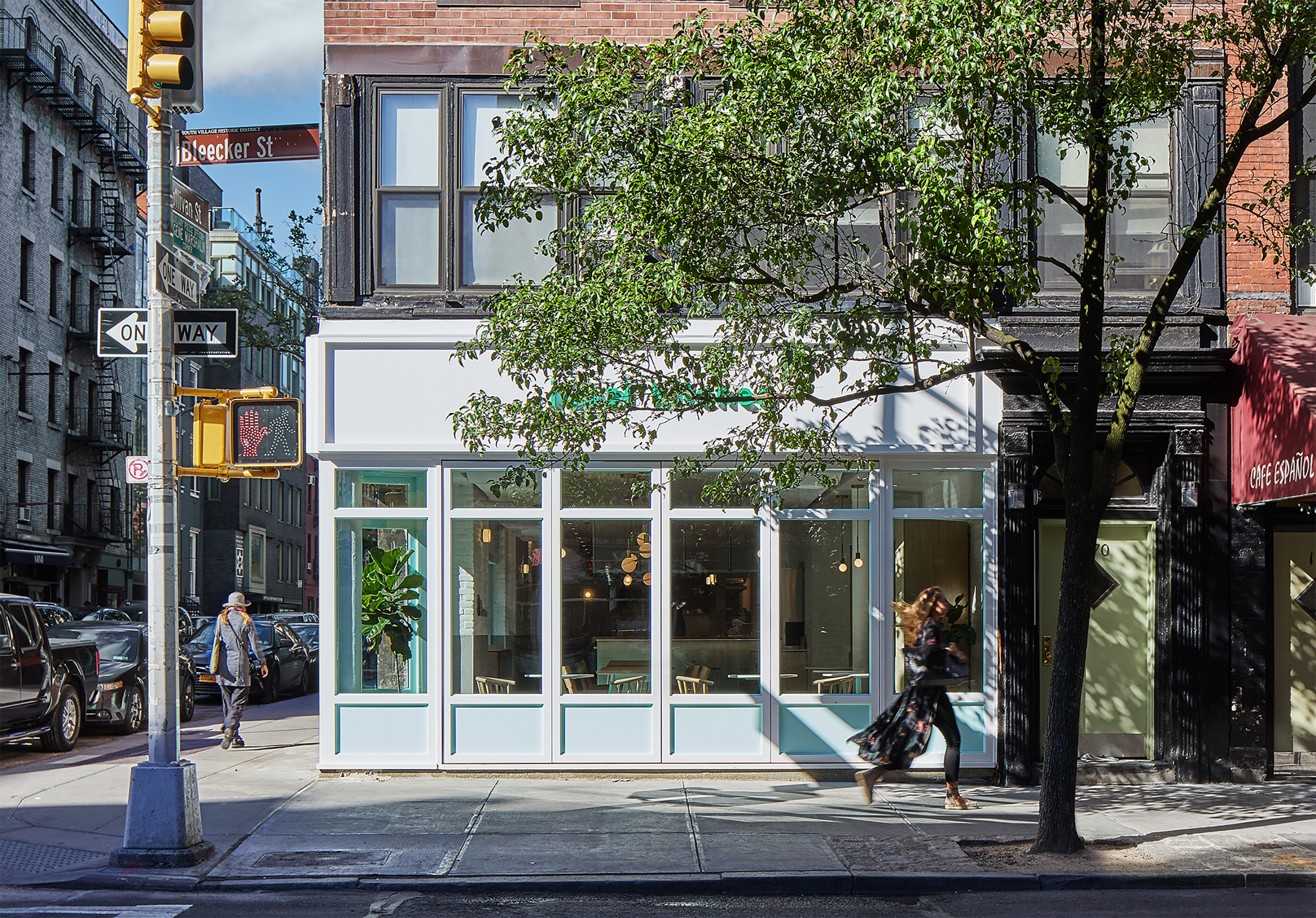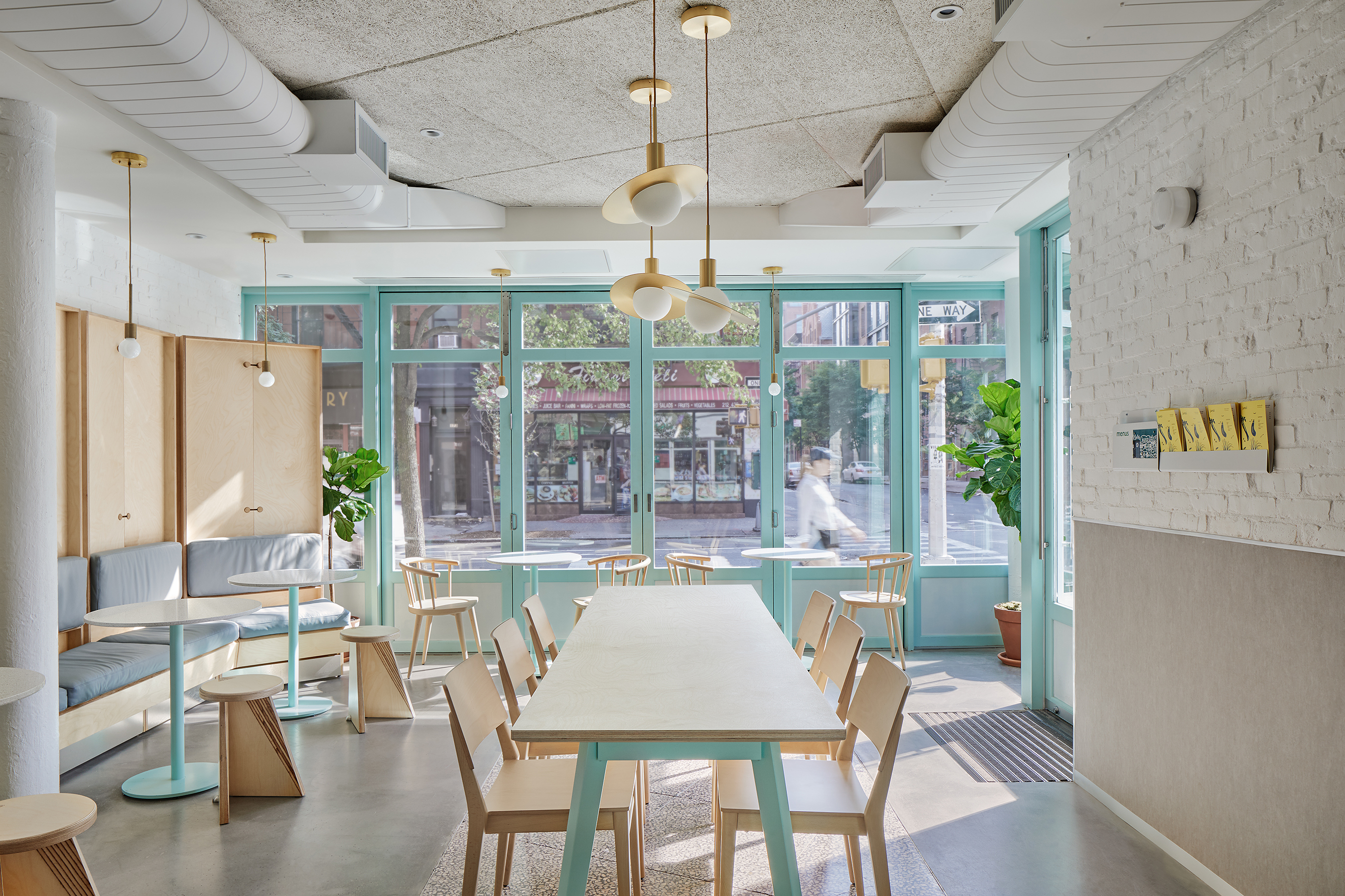 The restaurant is light and bright, with concrete floors, white brick walls and pale wood seating. Soft green and pink colours are used for accents throughout, and can be seen on the windows, table posts, tiles, and a mesh design above the bar.