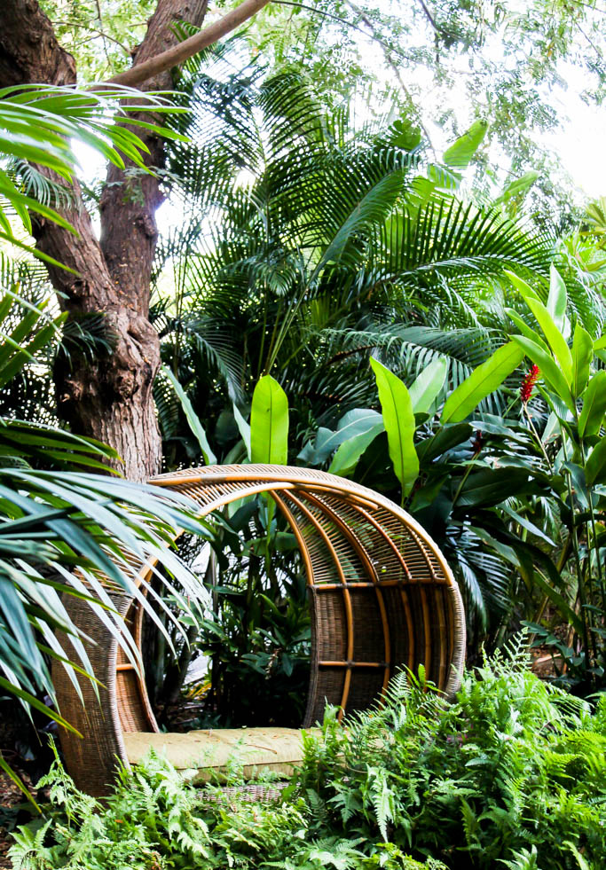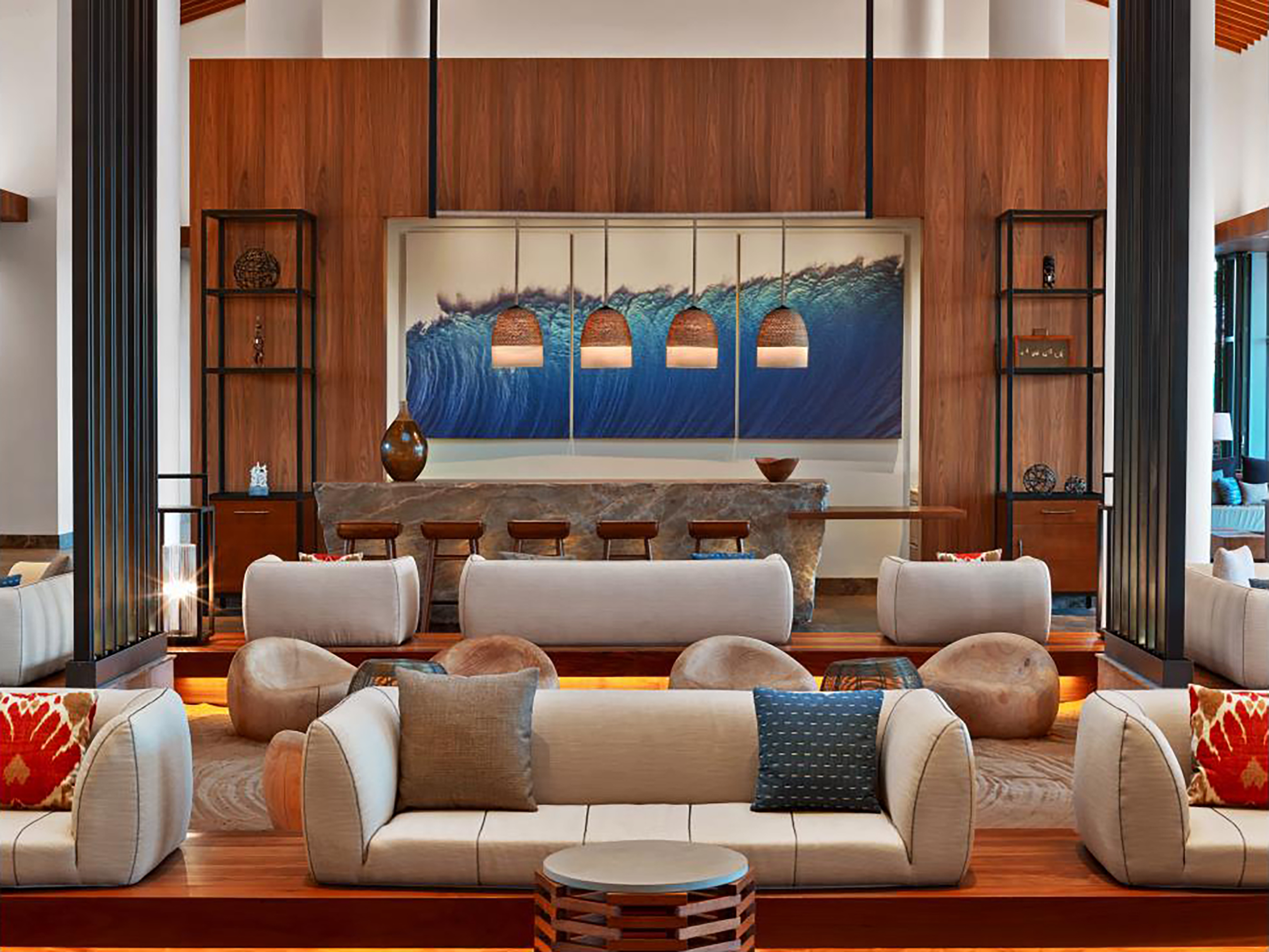 The design of the rooms within the Wailea Resort extends the far reaching view of the campus. Individual rooms consist of custom-designed furniture, including platform beds with side tables in a walnut finish, and teak wood slat vanity units.